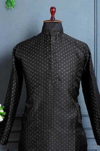 SIZE : M(38), L(40) ,XL(42) ,XXL(44)SKU: 82255-4 - NEW ARRIVAL JACQUARD PRINTED WORK MEN’S KURTA PAYJAMA BLACK ₹643.00