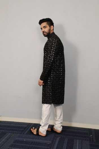 SIZE : M(38) , L(40) , XL(42) , 2XL(44) , 3XL(46)SKU: 80000-3 - DESIGNER SILK EMBROIDERY MIRROR WORK MEN’S KURTA PAYJAMA BLACK ₹1,039.00