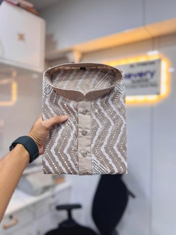 CONTAIN : MENS KURTA ,PAJAMASKU: 81797-4 - TRENDING SILK LUCKNOWI SEQUENCE WORK MEN’S KURTA WITH PAYJAMA PEACH ₹1,042.00