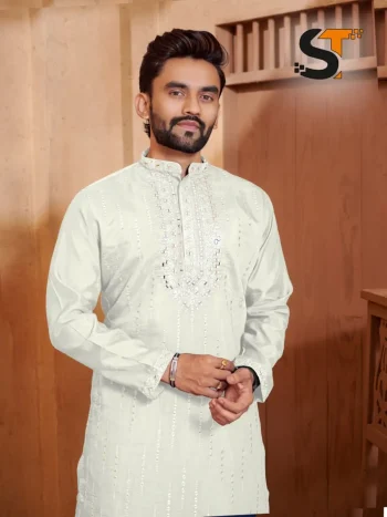 WORK : EMBROIDERY SEQUENCE WORKSKU: 82768-6 - NEW ARRIVAL ROMAN SILK REAL MIRROR AND EMBROIDERY WORK MEN’S KURTA PAYJAMA OFF WHITE ₹1,287.00