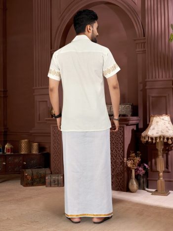 REFFER SIZE CHARTSKU: 76557-7 - FANCY COTTON FOIL PRINT WITH BEAUTIFUL PATTERN WORK MEN’S SHIRT WITH MATCHING DHOTI WHITE ₹764.00