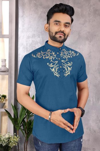 SIZE : M(38), L(40), XL(42), 2XL(44)SKU: 80120-3 - LATEST COTTON SLUB PRINTED MEN’S SHORT KURTA BLUE ₹346.00