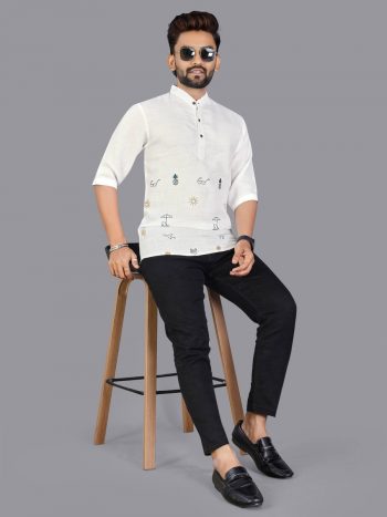 SIZE :-M(38),L(40),XL(42),XXL(44)SKU: 70413-2 - RICH LOOK LINEN HAND-WOVEN DESIGNS MEN’S SHORT KURTA WHITE ₹499.00