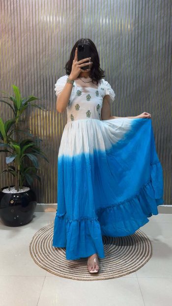 SIZE : S(36), M(38), L(40), XL(42), XXL(44), 3XL(46), 4XL(48), 5XL(50)SKU: 79198-1 - DESIGNER CHIKANKARI COTTON CUT PATTERNS AND PRINTED FADED WORK ONE PIECE SKY ₹1,249.00