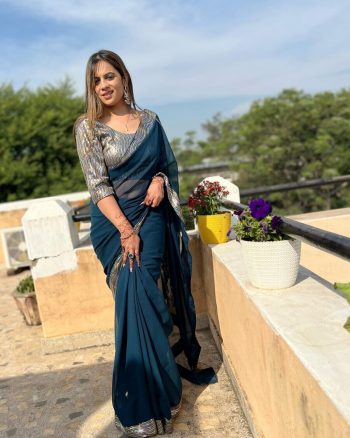 BLOUSE LENGTH :- 1.20 CM (UNSTITCHED)SKU: 76741-5 - MODERN GEORGETTE SILK SWAROVSKI WORK SAREE WITH UNSTITCHED BLOUSE NAVY BLUE ₹624.00
