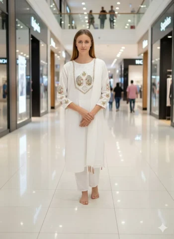 SIZE : S, M, L, XL, XXLSKU: 77232-2 - FANCY RAYON SLUB SEQUENCE CODING EMBROIDERY WORK TOP BOTTOM WITH DUPATTA WHITE ₹1,041.00