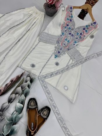 DUPATTA : HEAVY GEORGETTE WITH BEAUTIFUL SEQUENCE EMBROIDERY WORKSKU: 73814 - FANCY CREPE EMBROIDERY SEQUENCE WORK WITH REAL MIRROR HAND WORK TOP PALAZZO WITH DUPATTA WHITE ₹1,527.00