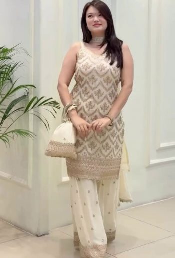 DUPATTA LENGTH : 2.20 METERSKU: 55889-2 - DESIGNER GEORGETTE EMBROIDERY SEQUENCE WITH RIVET MOTI WORK TOP PALAZZO WITH DUPATTA WHITE ₹2,015.00