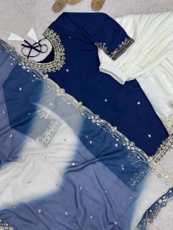 WORK :- EMBROIDERY WORKSKU: 81693 - NEW ARRIVAL GEORGETTE EMBROIDERY SEQUENCE WORK WITH RIVET MOTI WORK TOP PALAZZO WITH DUPATTA BLUE ₹1,598.00