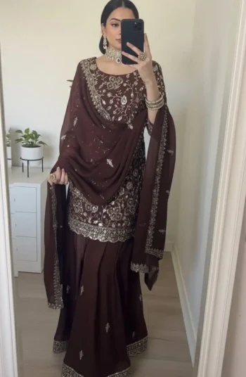 SIZE: XL (42) Up to XXL Fully Stitched, Completely Ready to WearSKU: 73136-2 - DESIGNER GEORGETTE EMBROIDERY SEQUENCE WORK TOP PALAZZO WITH DUPATTA BROWN ₹1,388.00