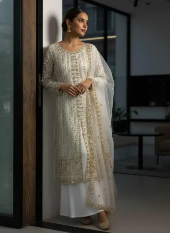 DUPATTA FABRIC :- HEAVY FAUX GEORGETTE 3MM EMBROIDERY SEQUENCE LACE BORDER FANCY BORDERS WORK AND WORKSKU: 74052 - DESIGNER GEORGETTE SEQUENCE & ZARI EMBROIDERY WORK TOP PALAZZO WITH DUPATTA WHITE ₹1,499.00