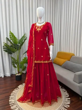 DUPATTA LENGTH :- 2.30 METERSKU: 70452 - DESIGNER GEORGETTE THREAD WITH SEQUENCE WORK TOP PALAZZO WITH DUPATTA RED ₹1,571.00