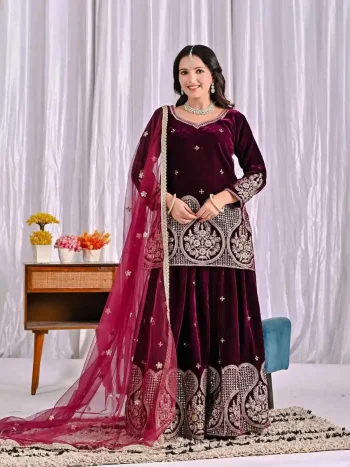 LENGTH : 2.20 METERSKU: 78513-2 - RICH LOOK VISCOSE VELVET EMBROIDERY MULTI NEEDLE SEQUENCE WORK TOP PALAZZO WITH DUPATTA MAROON ₹1,786.00
