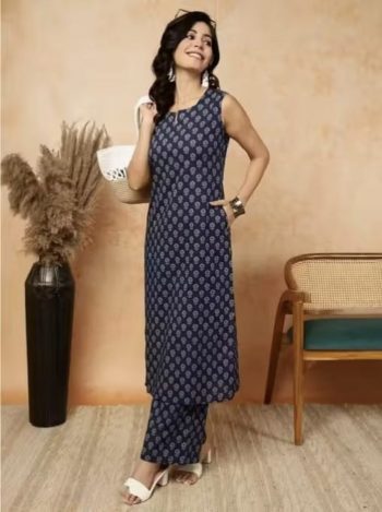 LENGTH : 38+ INCHSKU: 82302-3 - RICH LOOK COTTON BLEND PRINTED WORK TOP BOTTOM SET BLUE ₹583.00