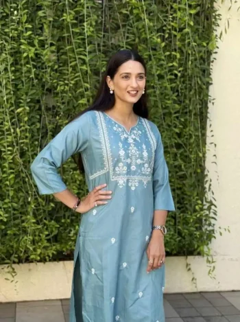 CAP :- IMPORTANT STRETCHABLE LYCRASKU: 82699-3 - DESIGNER POLY RAYON EMBROIDERY WORK TOP PENT SET SKY ₹729.00