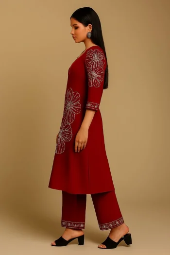 SIZE : M-38, L-40, XL-42, 2XL-44SKU: 77973-2 - DESIGNER RAYON EMBROIDERY SEQUENCE WORK KURTI WITH PANT WINE ₹625.00