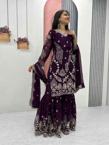 SIZE : XS 34, S 36, M 38, L 40, XL 42 , XXL 44SKU: 77368-1 - DESIGNER GEORGETTE EMBROIDERY THREAD AND SEQUENCE WORK TOP SHARARA WITH DUPATTA WINE ₹1,857.00
