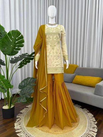 WORK : KODI LACE WORKSKU: 82965 - ATTRACTIVE CREPE THREAD WITH SEQUENCE WORK TOP SHARARA WITH DUPATTA MUSTARD ₹1,319.00