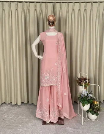 WORK : CODING SEQUENCE EMBROIDERY WORKSKU: 82734-1 - DESIGNER GEORGETTE EMBROIDERY SEQUENCE WORK WITH RIVET MOTI WORK TOP SHARARA WITH DUPATTA BABY PINK ₹1,805.00