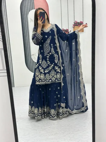 SIZE : XS 34 /S 36 /M 38 /L 40 /XL 42 /XXL 44SKU: 77341-3 - DESIGNER GEORGETTE EMBROIDERY THREAD AND SEQUENCE WORK TOP SHARARA WITH DUPATTA NAVY BLUE ₹1,857.00