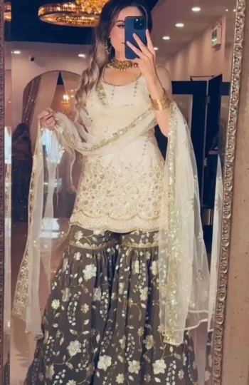 - TRENDING SATIN SILK EMBROIDERY SEQUENCE WORK TOP SHARARA WITH DUPATTA OFF WHITE ₹1,527.00