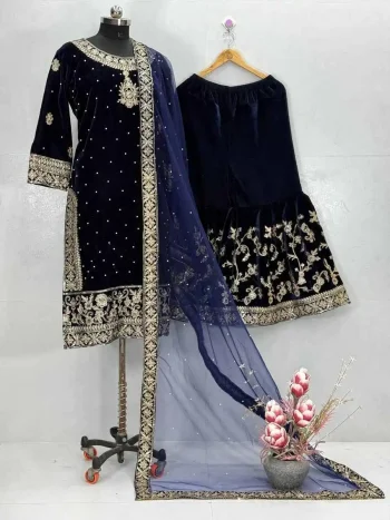 LENGTH : 2.30 METERSKU: 82103 - DESIGNER VELVET EMBROIDERY SEQUENCE WORK TOP PALAZZO WITH DUPATTA NAVY BLUE ₹1,285.00