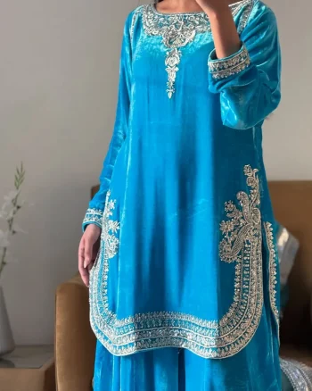 SIZE : 2.2 METERSKU: 81344-2 - DESIGNER VELVET EMBROIDERY CHAIN SEQUENCE WORK TOP PALAZZO WITH DUPATTA SKY ₹1,428.00