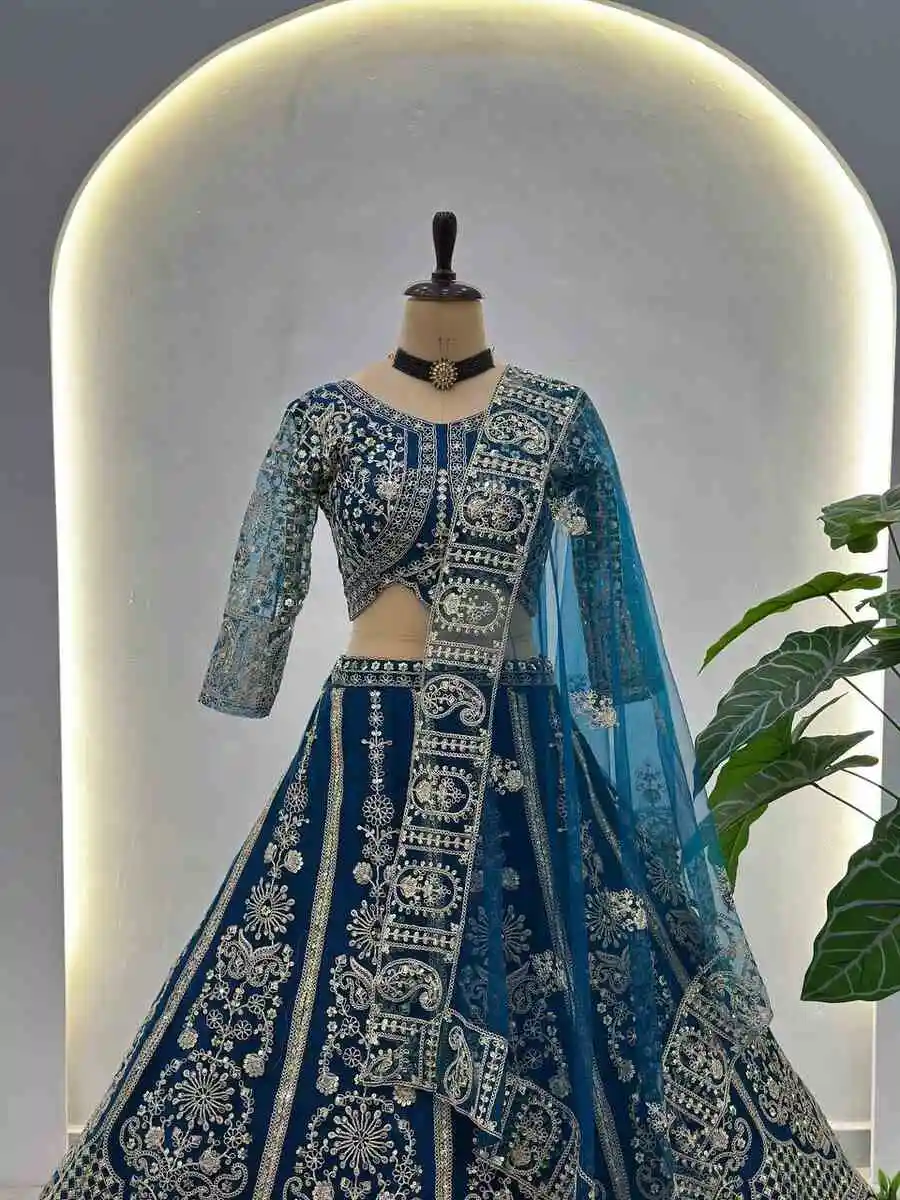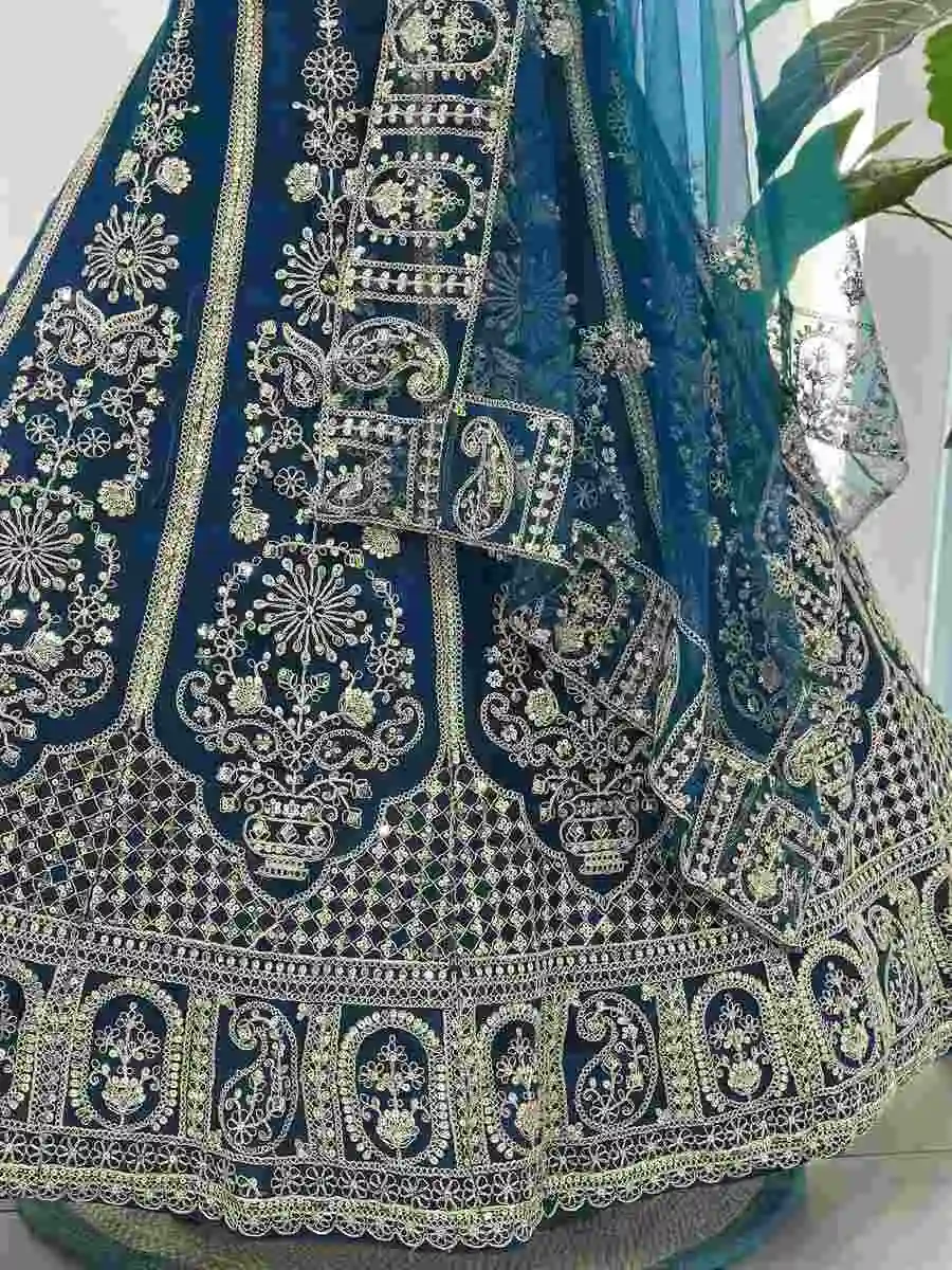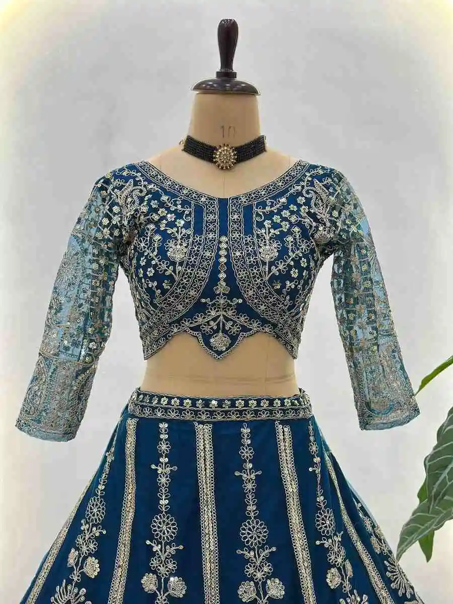 AATRACTIVE BUTTURFLY NET SEQUENCE AND CODING EMBROIDERY WORK LEHENGA CHOLI WITH DUPATTA BLUE