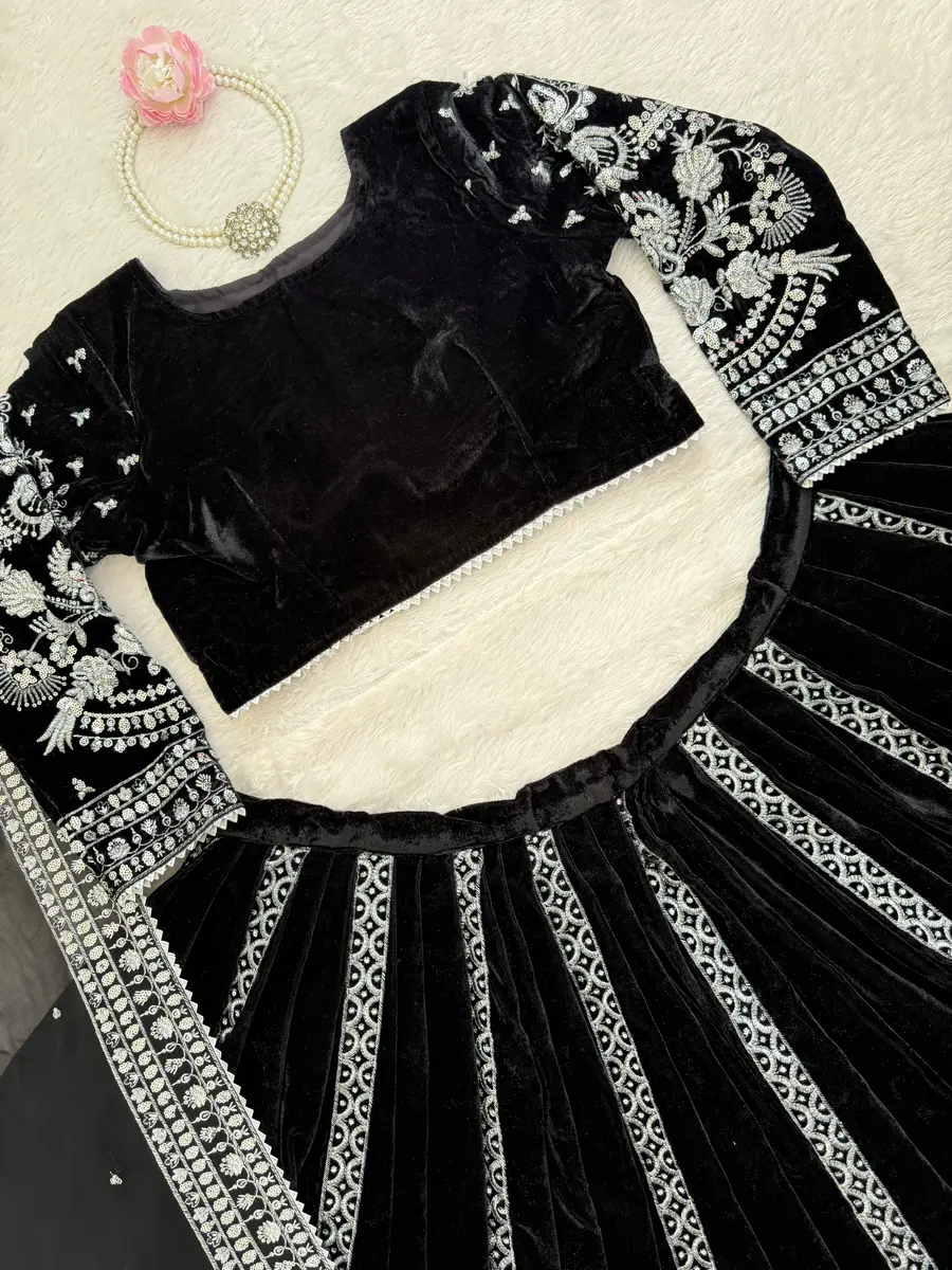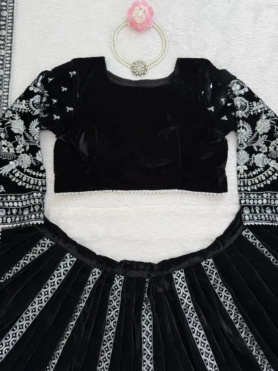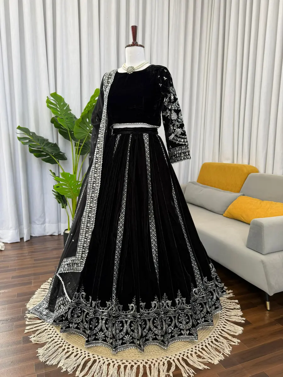 ASTHETIC VELVET THREAD WITH SEQUENCE WORK LEHENGA CHOLI WITH DUPATTA BLACK