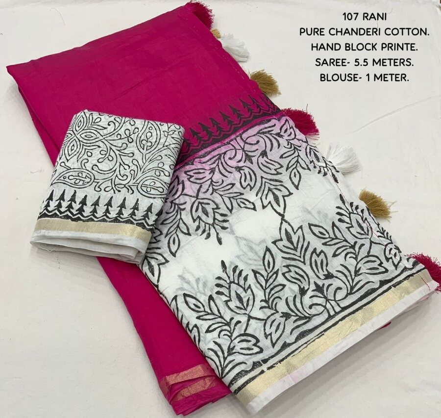 ATTRACTIVE CHANDERI COTTON WHITE CONTRACT HAND-BLOCK PRINTED PANEL WORK SAREE WITH UNSTITCHED BLOUSE PINK