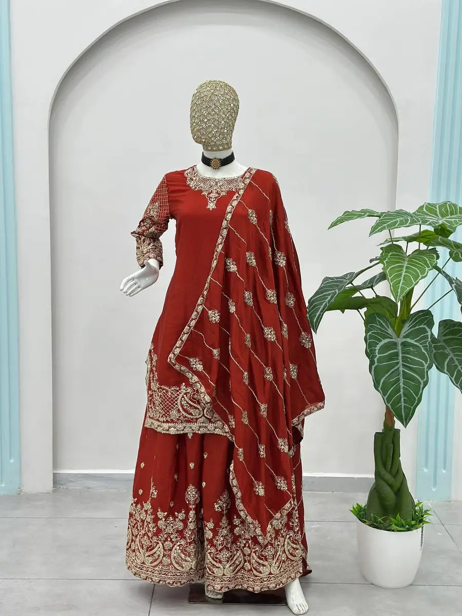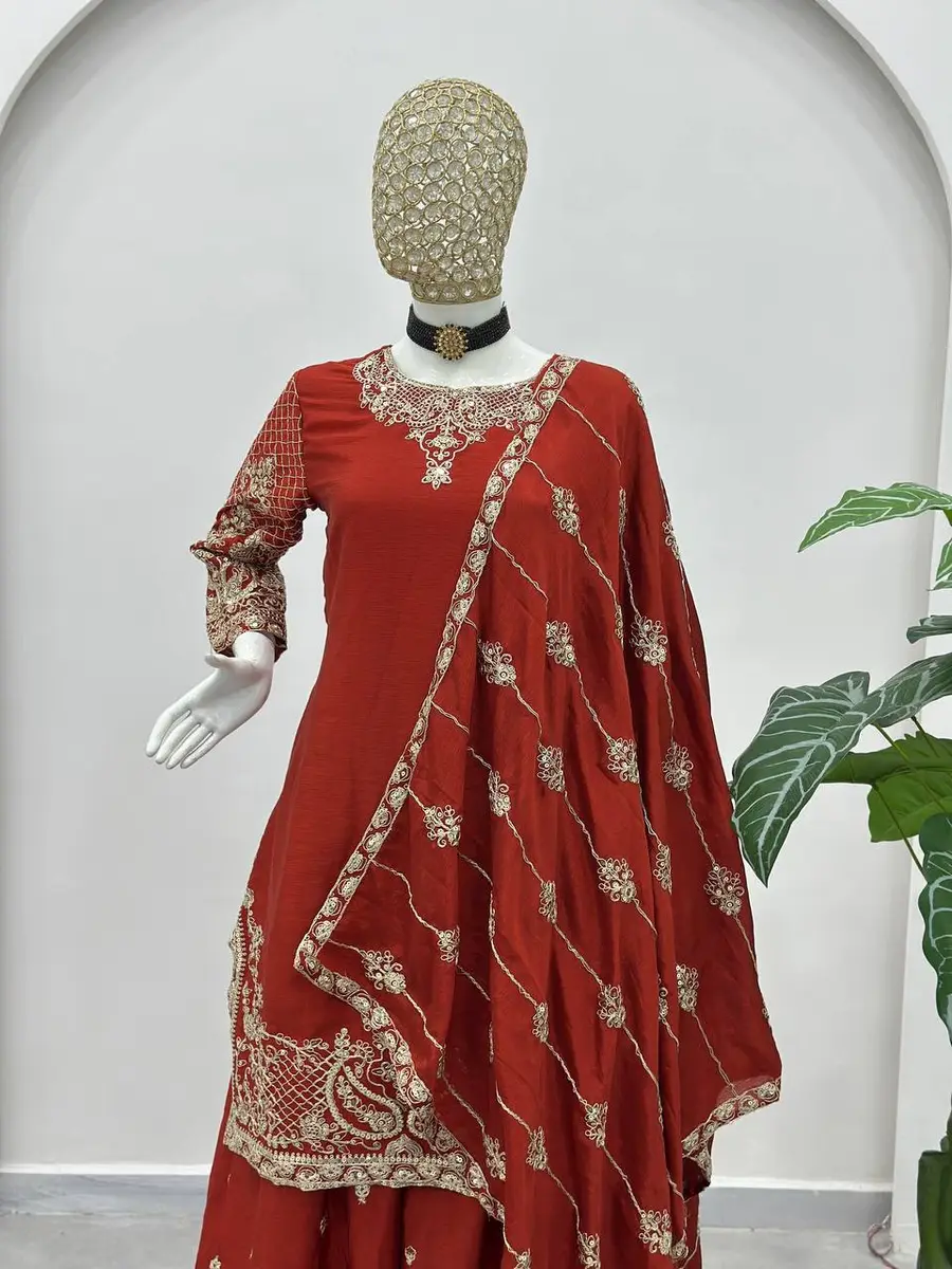 ATTRACTIVE CHINON SILK EMBROIDERY CODING SEQUENCE ZARI WORK TOP PALAZZO WITH DUPATTA ORANGE