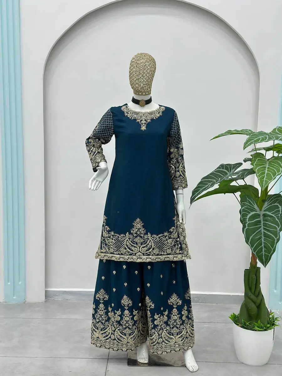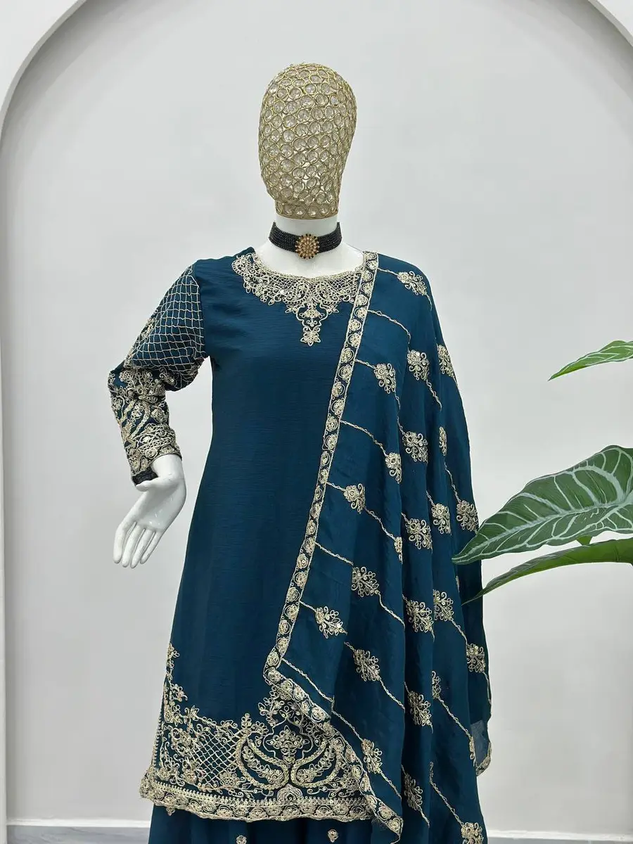 ATTRACTIVE CHINON SILK EMBROIDERY CODING SEQUENCE ZARI WORK TOP PALAZZO WITH DUPATTA TEAL