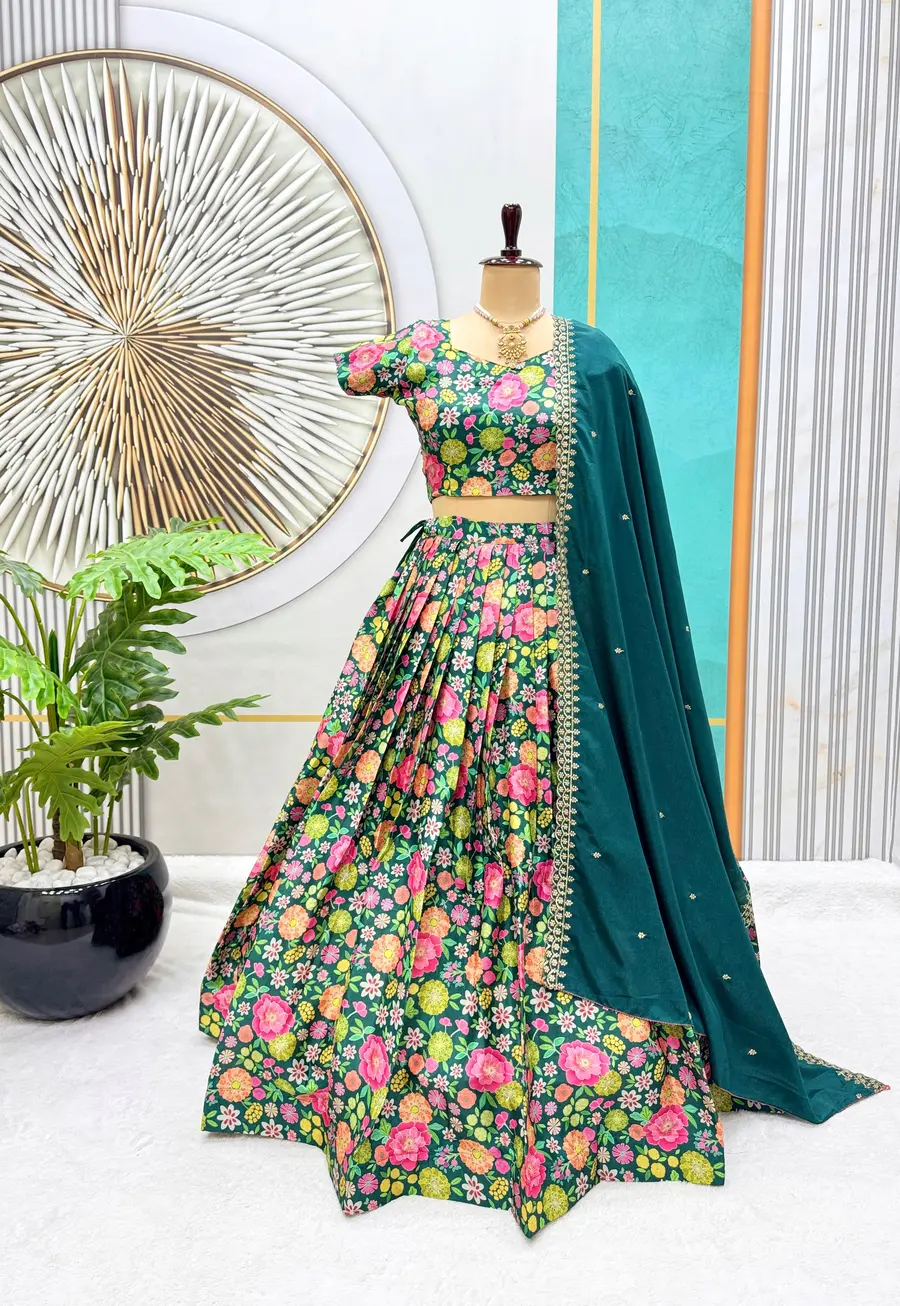 ATTRACTIVE CHINON SILK PRINTED EMBROIDERY WORK LEHENGA CHOLI WITH DUPATTA GREEN