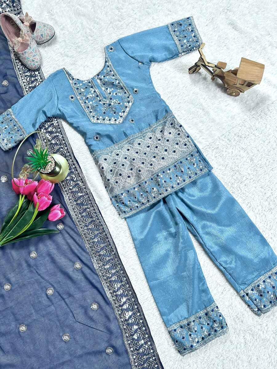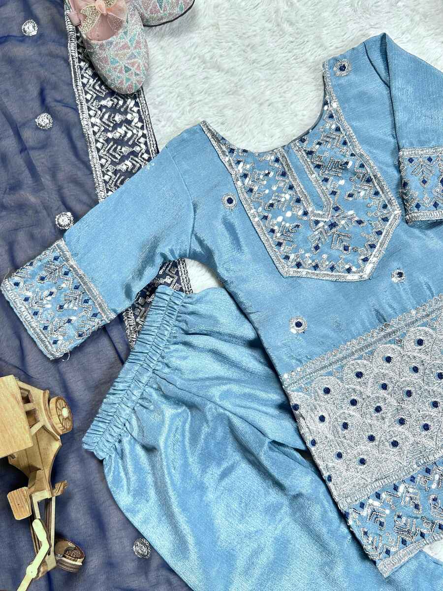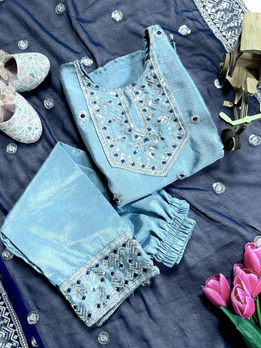 ATTRACTIVE CHINON SILK SEQUENCE EMBROIDERY WORK TOP BOTTOM WITH DUPATTA BLUE