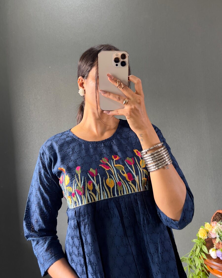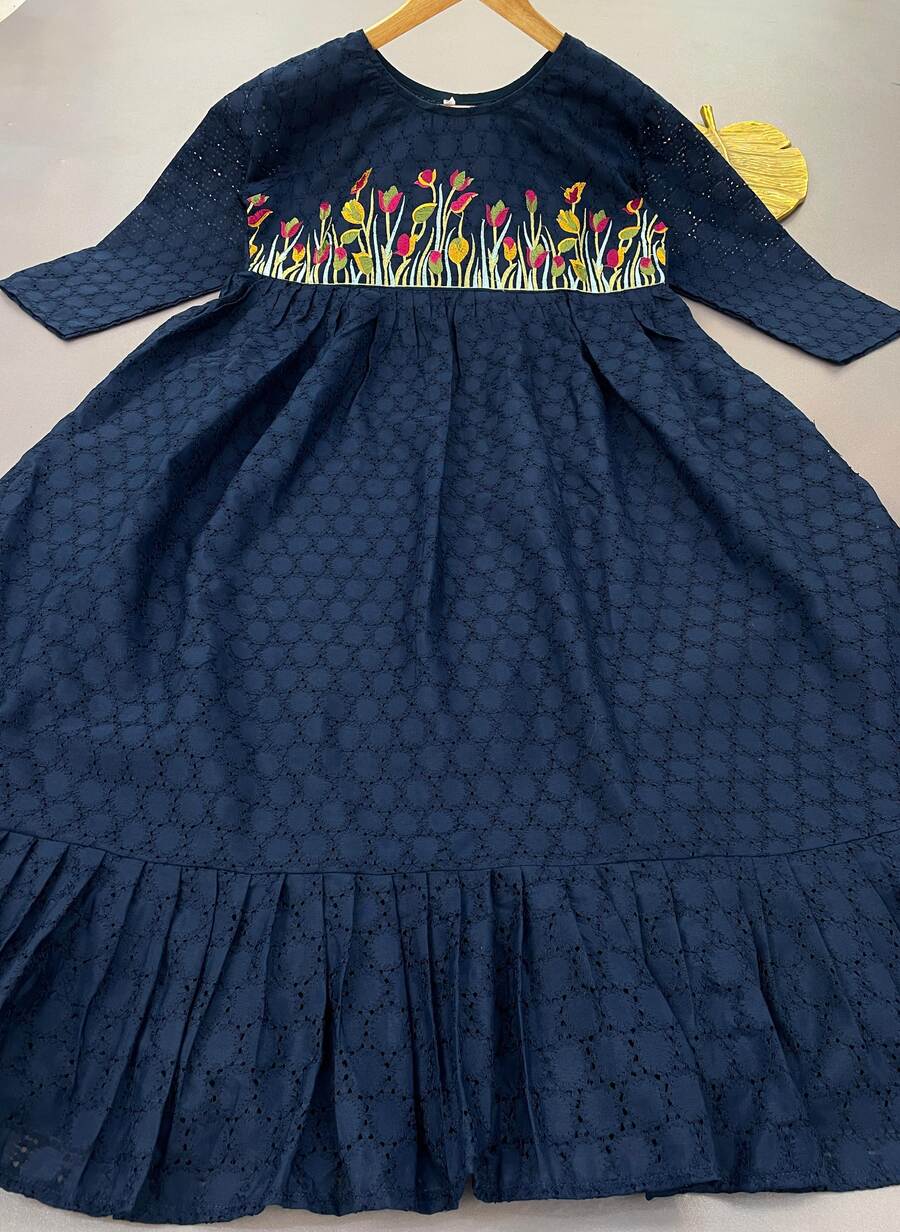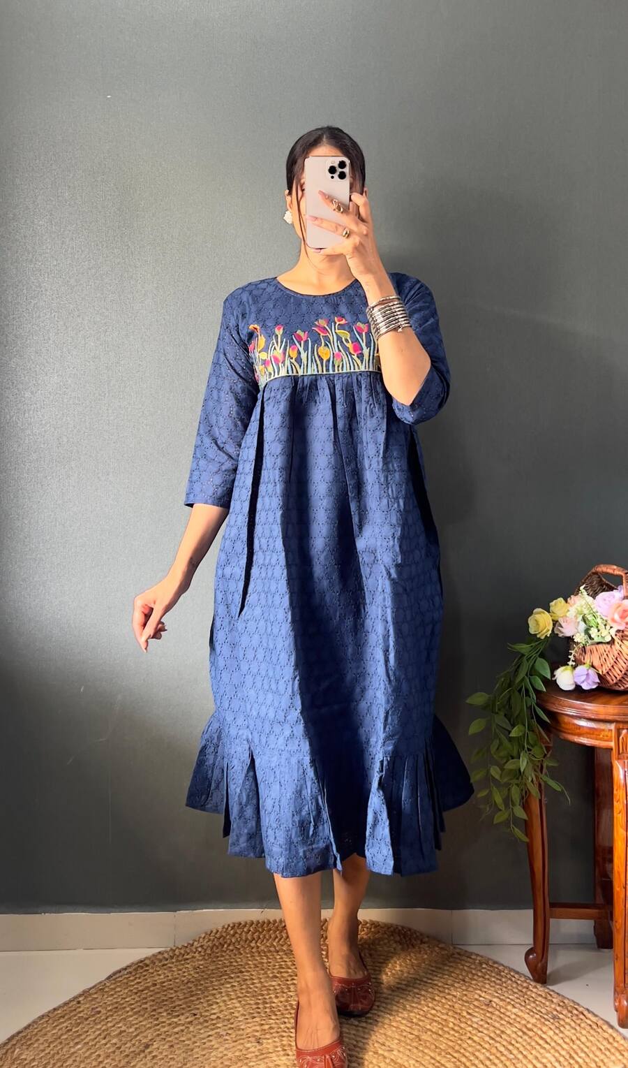 ATTRACTIVE COTTON EMBROIDERY MAXI DRESS ONE PEICE BLUE
