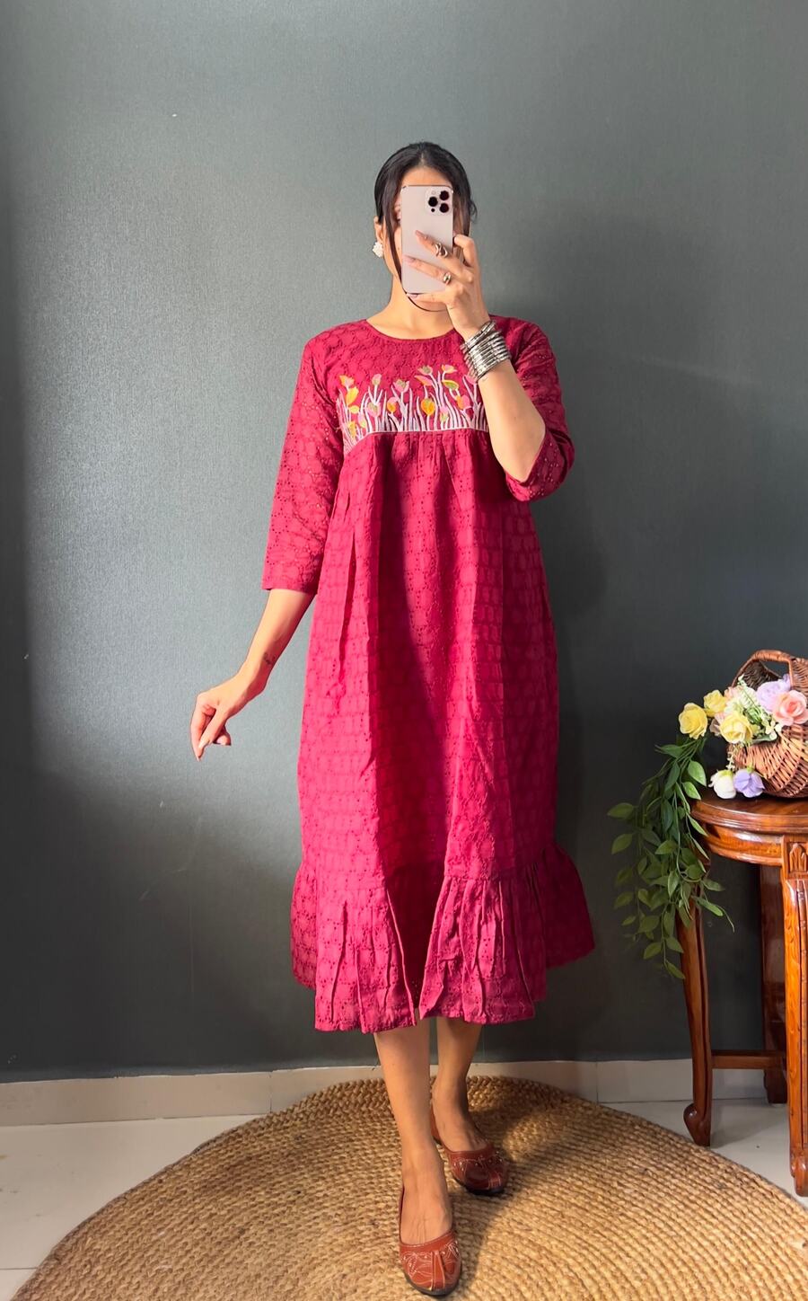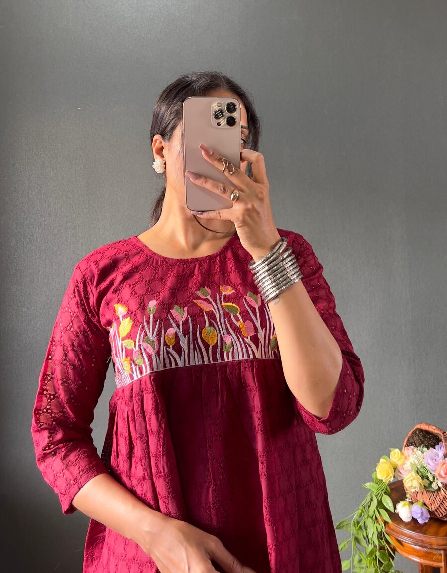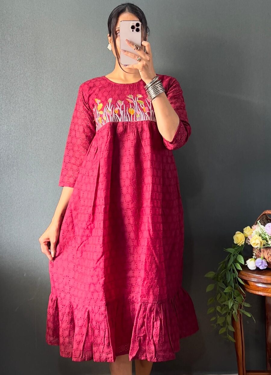 ATTRACTIVE COTTON EMBROIDERY MAXI DRESS ONE PEICE MAROON