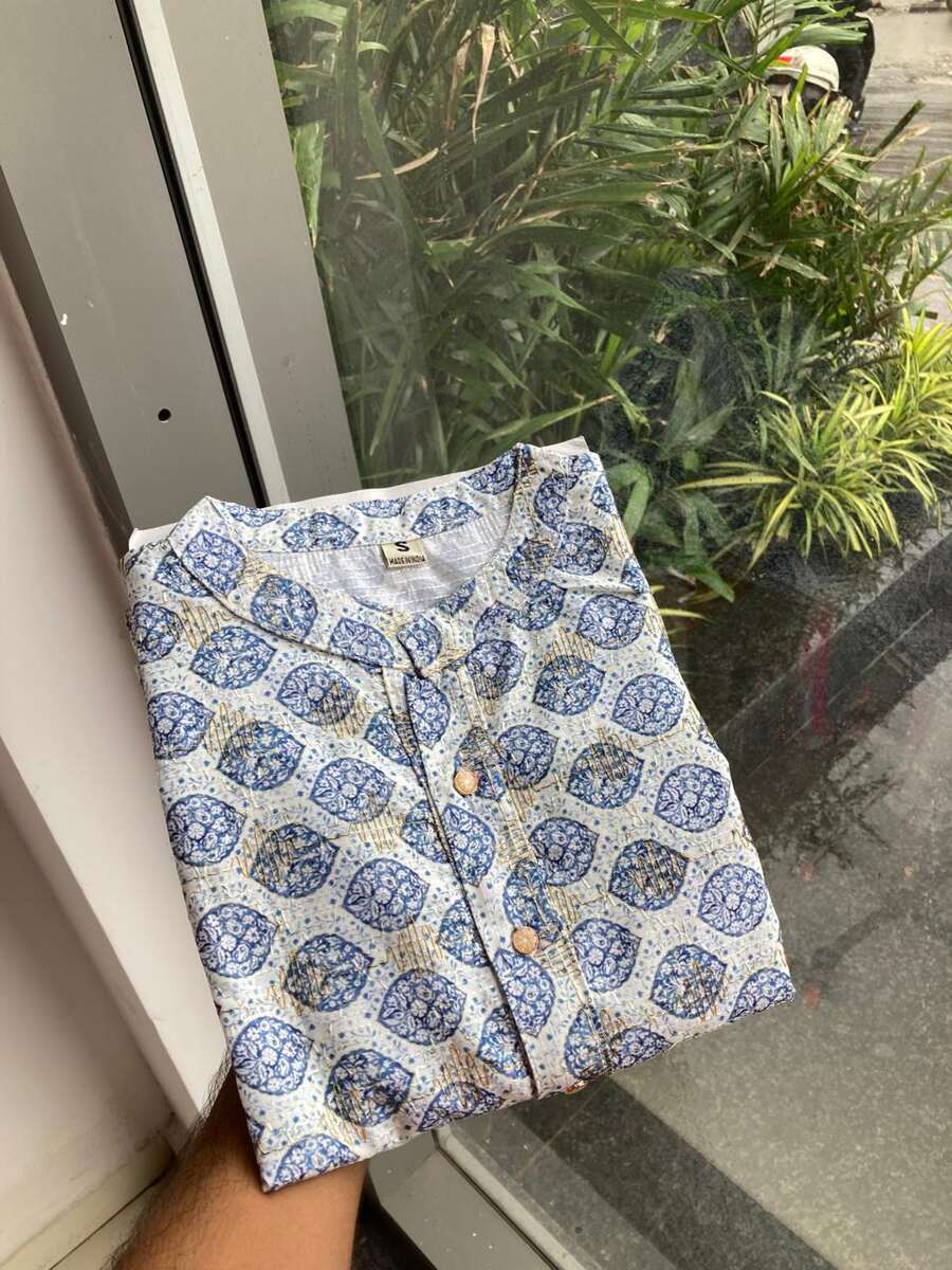 ATTRACTIVE COTTON SCHIFFLI CROCHET SEQUENCE WORK WITH DIGITAL PRINT MEN’S KURTA SKY