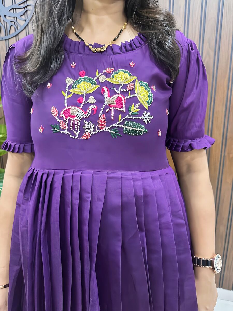 ATTRACTIVE COTTON SILK HANDWORK ONE PEICE DRESS PURPLE