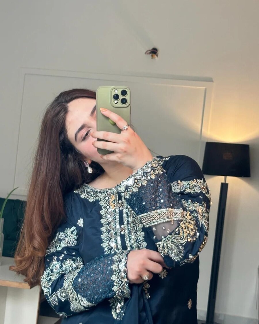 WORK : EMBROIDERY 5 MM SEQUENCE WORK WITH FANCY BELL SLEEVE & FANCY MOTI LATKAN