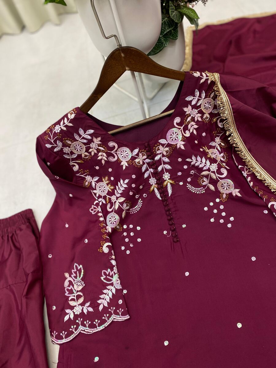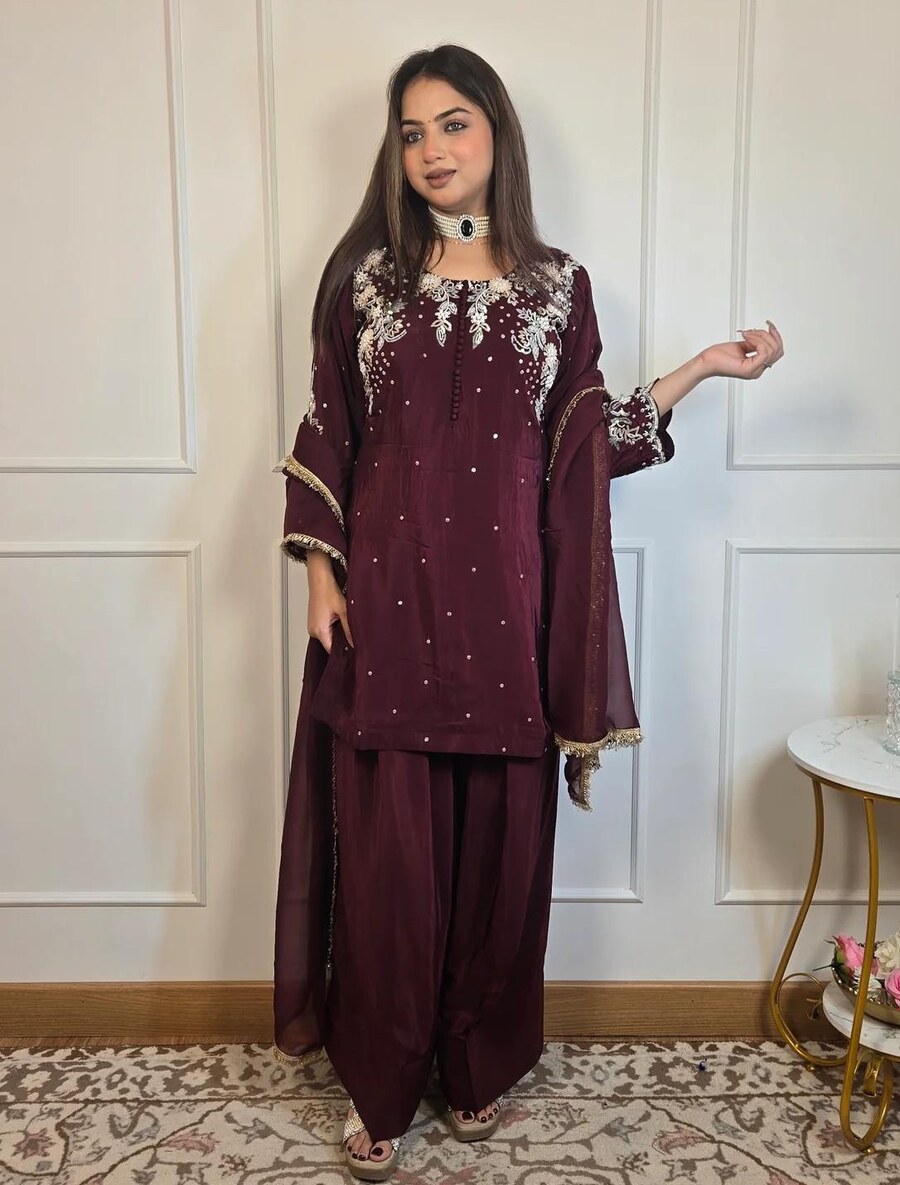 ATTRACTIVE CREPE SEQUENCE EMBROIDERY WORK TOP PATIYALA WITH DUPATTA MAROON