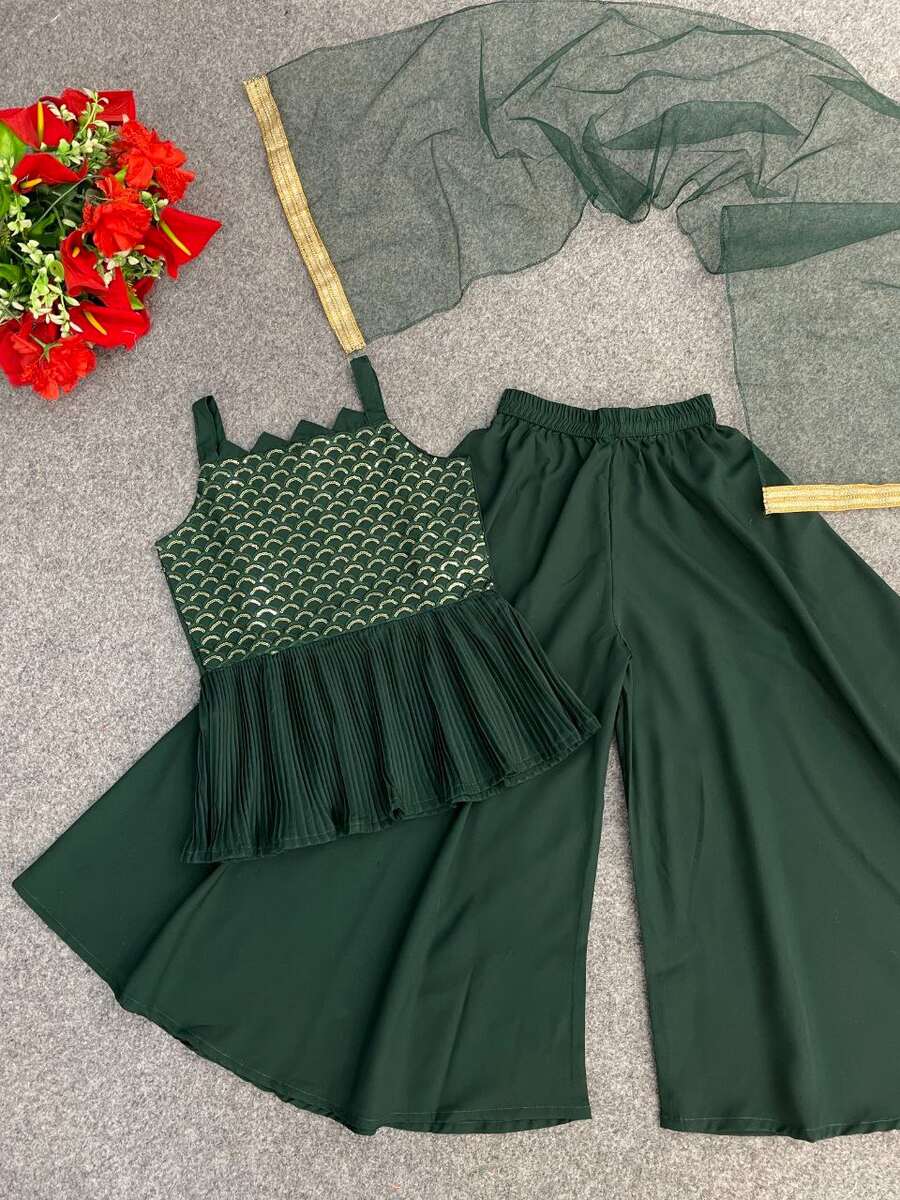 ATTRACTIVE CREPE SEQUENCE WORK KID’S TOP PALAZZO WITH DUPATTA GREEN