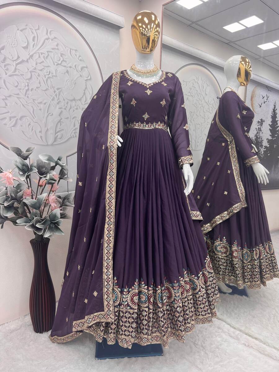 GOWN FABRIC: GEORGETTE WORK: EMBROIDERY THREAD AND SEQUENCE DESIGN WORK FLAIR: 2.70 Meter INNER: CRAPE SILK DUPPATA: NET WITH EXCLUSIVE FANCY READYMADE LACE BORDER SIZE: XL FULL STITCHED