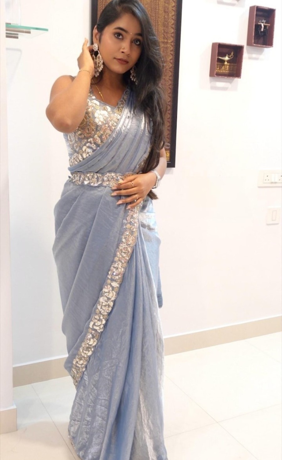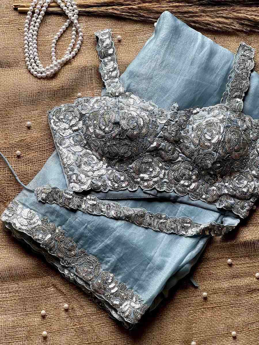 ATTRACTIVE FENDY SILK CODING AND SEQUENCE EMBROIDERY WORK LACE BORDER WORK SAREE WITH UNSTITCHED BLOUSE AND WAST BELT SKY