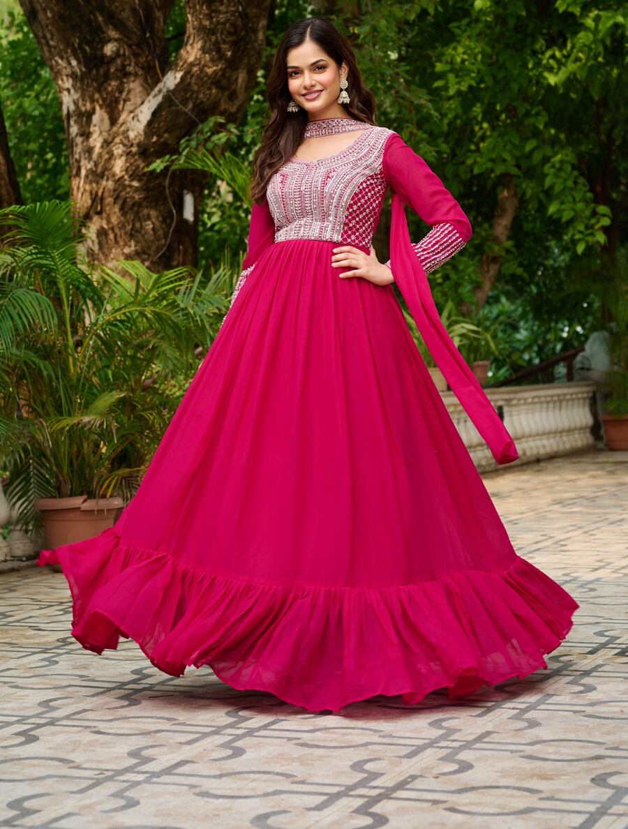 ATTRACTIVE GEORGETTE EMBROIDERY BEADS SEQUENCE -WORK GOWN WITH DUPATTA PINK