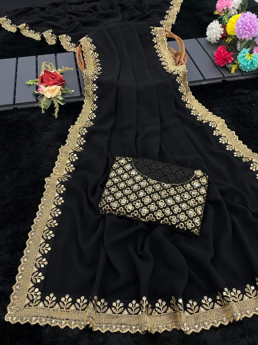 ATTRACTIVE GEORGETTE EMBROIDERY CUTWORK LACE SAREE WITH UNSTITCHED BLOUSE BLACK