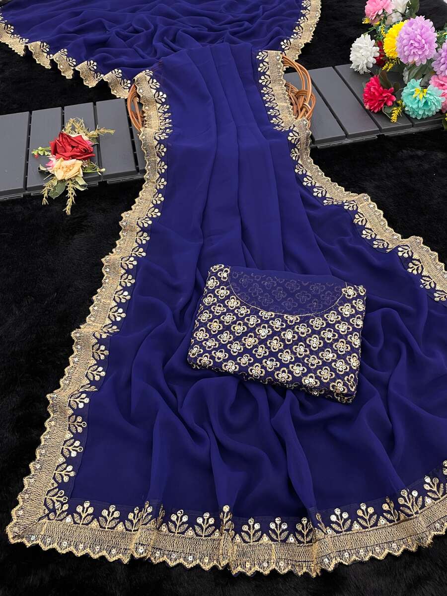 SAREE FABRIC :- PREMIUM GEORGETTE WITH ALL OVER SEQUENCE AND THREAD WORK AND BORDER IN EMBROIDERY CODING AND SEQUENCE WORK WITH FANCY CUT WORK