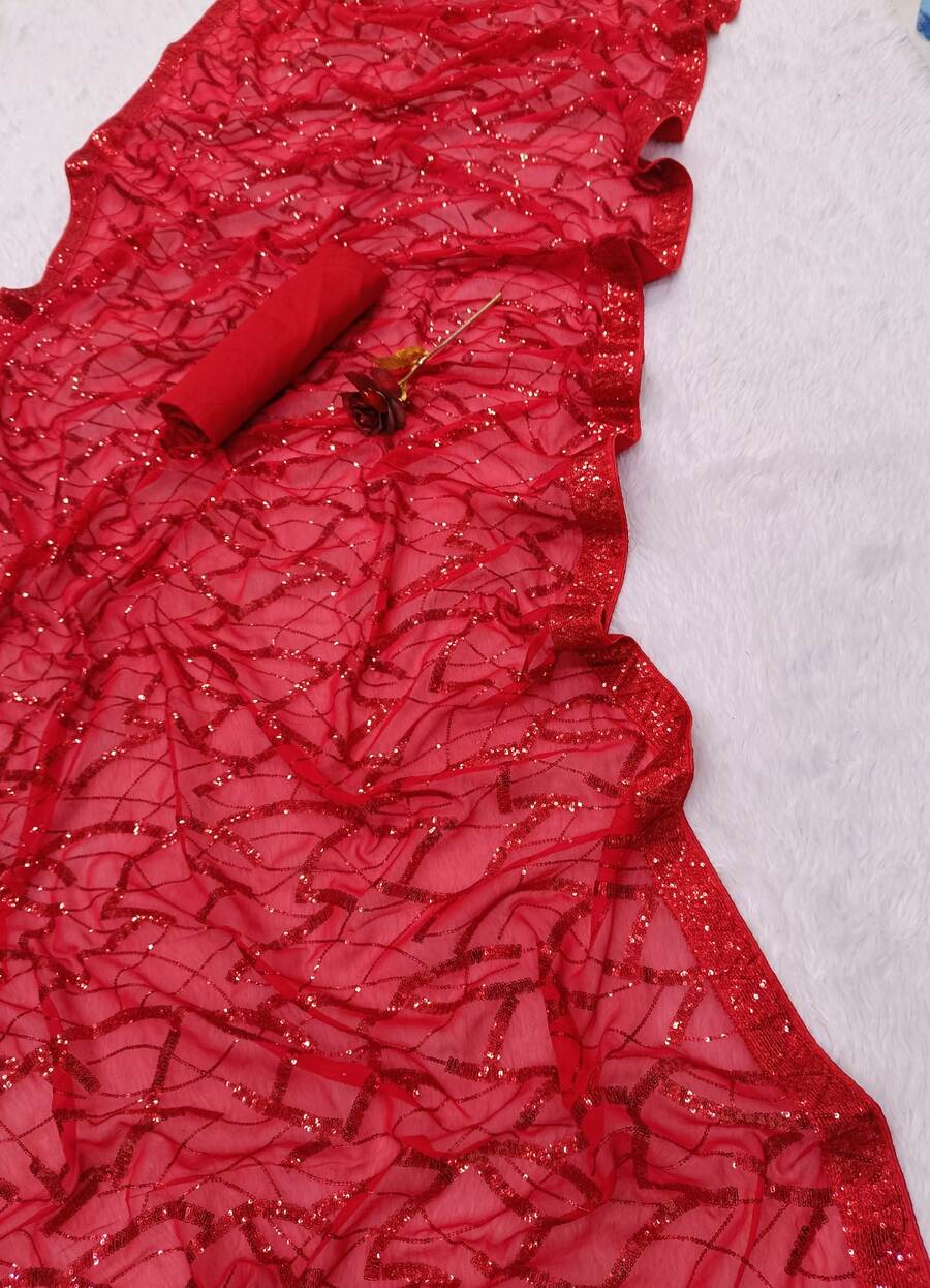 ATTRACTIVE GEORGETTE EMBROIDERY SEQUENCE AND LACE WITH PIPING WORK SAREE WITH UNSTITCHED BLOUSE RED