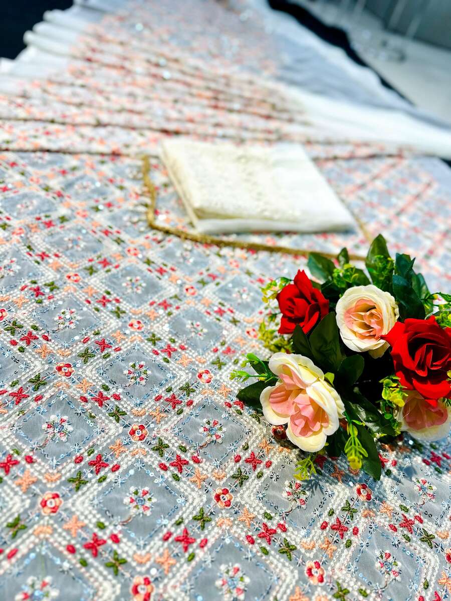 SAREE FABRIC : PREMIUM DIAMOND CHINON SILK WITH HEAVY EMBROIDERY CODING MULTI TREADS AND SEQUENCE WORK