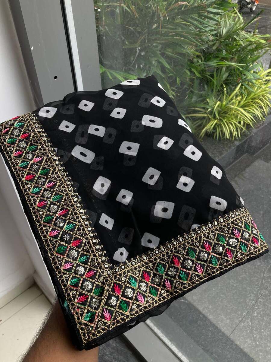 ATTRACTIVE GEORGETTE RAJWADI BANDHEJ PRINT WITH EMBROIDERY WORK SAREE WITH UNSTITCHED BLOUSE BLACK
