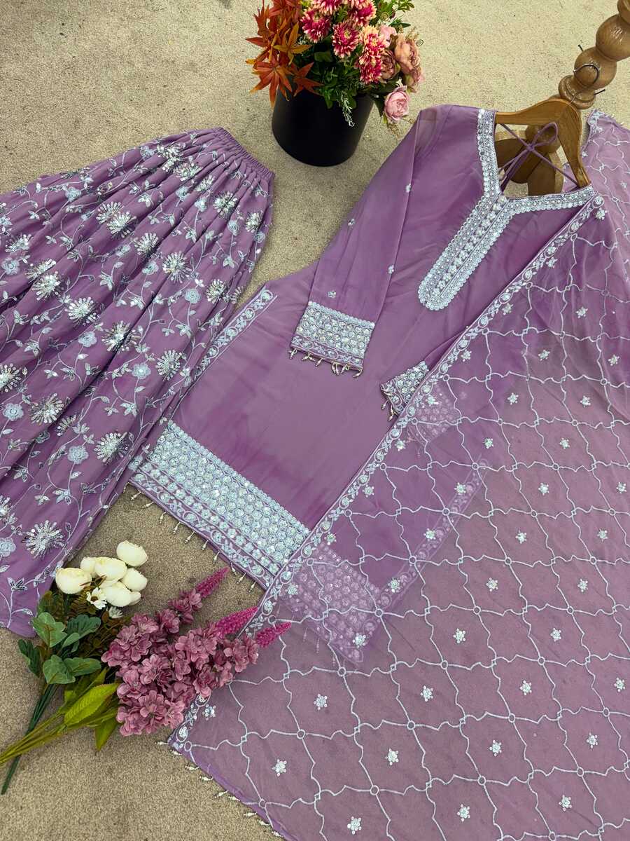 ATTRACTIVE GEORGETTE SEQUENCE EMBROIDERY WORK TOP PALAZZO WITH DUPATTA BABY PINK